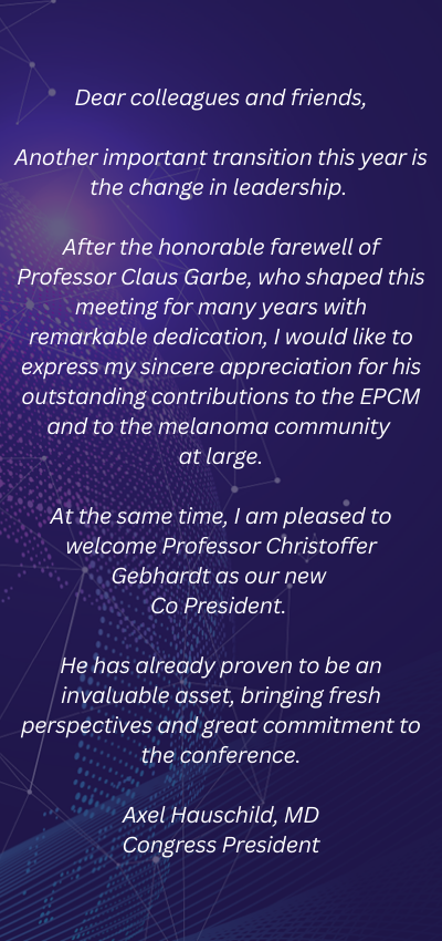 We are delighted to welcome you once again to the Interdisciplinary Global Conference on News in Melanoma / Skin Cancer – the “European Post-Chicago Meeting (EPCM)”!